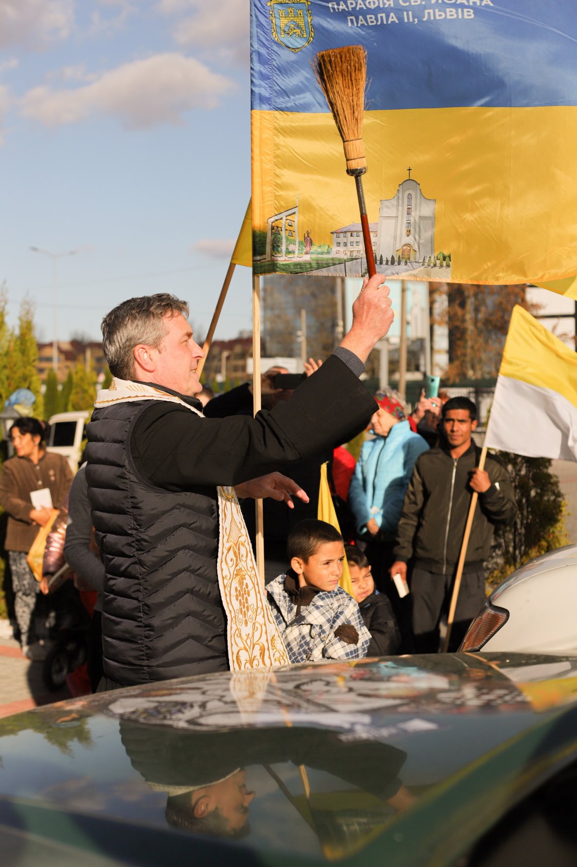 Настоятель сихівської парафії о. Яцек Коцур і настоятель парафії св. Йоана Павла ІІ о. Григорій Драус освятили автомобілі і поблагословили військових. Допомагали у проведенні урочистості Лицарі Колумба. Між іншими були присутні сім’ї з окупованих територій та прифронтових місцевостей, котрі знайшли прихисток в парафії св. Йоана Павла ІІ у Львові.