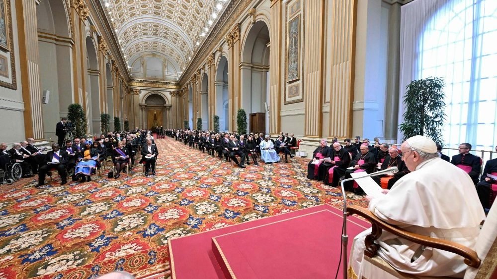 У контексті Різдва Святіший Отець навів слова пророка Ісаї, якими він передвіщав народження Князя миру. Глава Католицької Церкви зазначив, що дипломати є підтвердженням цінності миру й людського братерства, внесок у будування яких робить діалог. У цьому контексті він згадав про рішення деяких країн призначити послів-резидентів при Святому Престолі, про підписані минулого року двосторонні Угоди з деякими країнами, а також висловив побажання, що розвиватиметься діалог з КНР для сприяння життю Католицької Церкви та благу китайського народу. Водночас, він запевнив дипломатів у співпраці Державного Секретаріату та дикастерій Римської Курії.