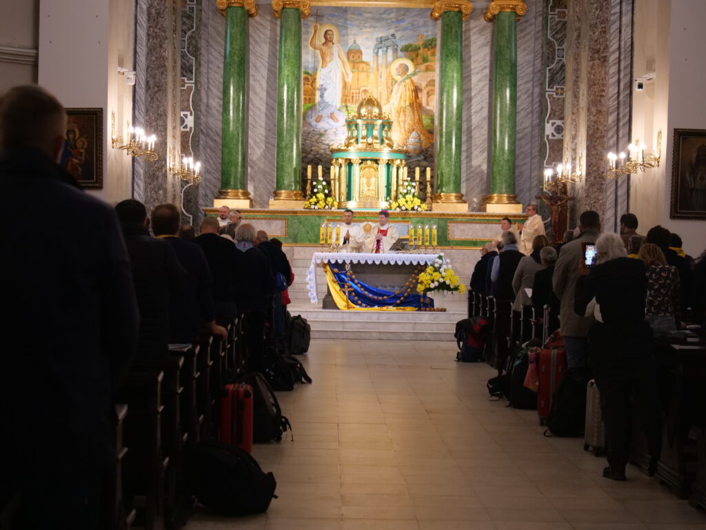 Паломництво розпочалося з відвідин Майдану Незалежності, символічного місця в сучасній історії України. У супроводі Апостольського нунція в Україні, архієпископа Вісвальдаса Кульбокаса, паломники вшанували хвилиною мовчання пам’ять загиблих у боротьбі проти російської агресії та спільно помолилися за полеглих. Після цього група вирушила до катедрального собору святого Олександра.