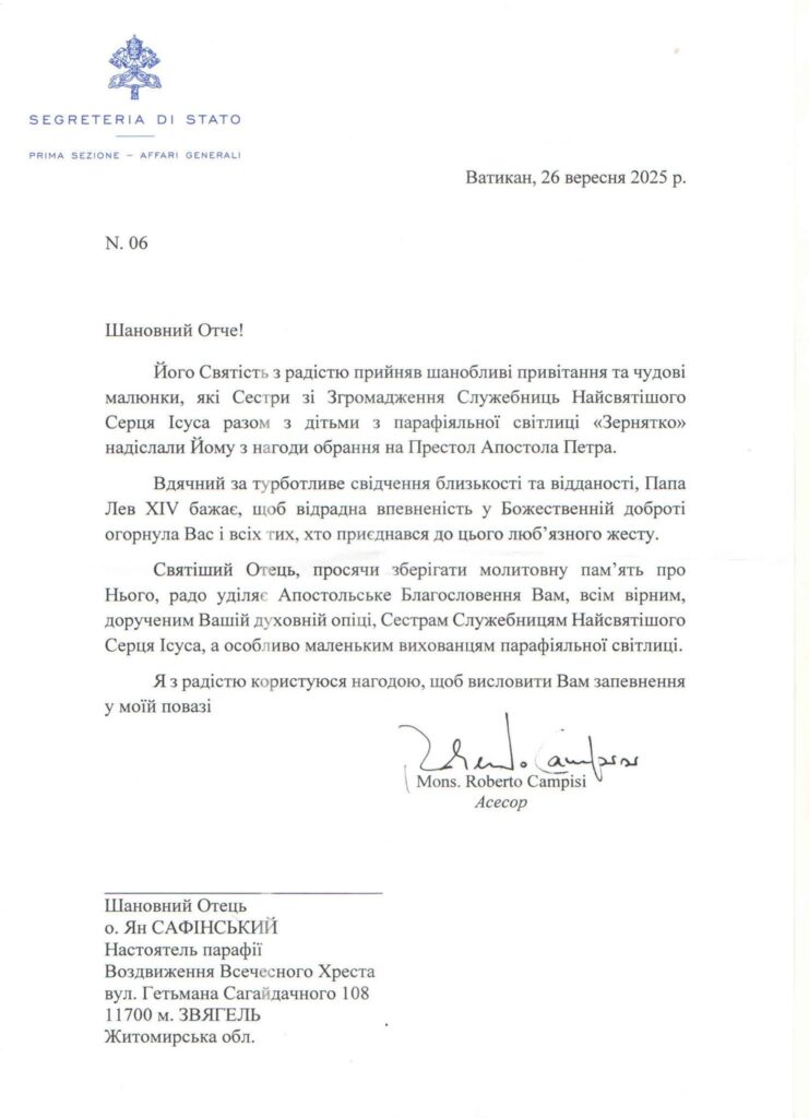 На території парафії Воздвиження Всечесного Хреста у Звягелі діє Світлиця «Зернятко». Нещодавно її вихованці отримали лист із благословенням від Святішого Отця Лева XIV.