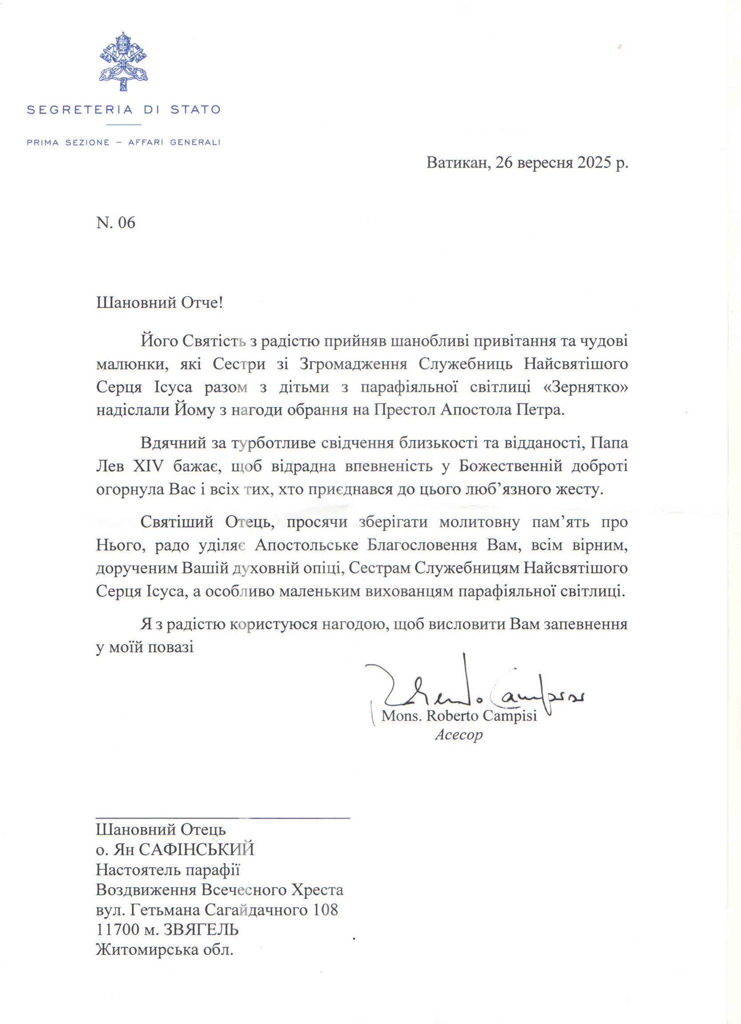 У ньому Папа дякує за постійну молитовну пам’ять про нього і уділяє своє апостольське благословення настоятелю парафії о. Яну Сафінському, усім парафіянам, сестрам та вихованцям Світлиці «Зернятко».