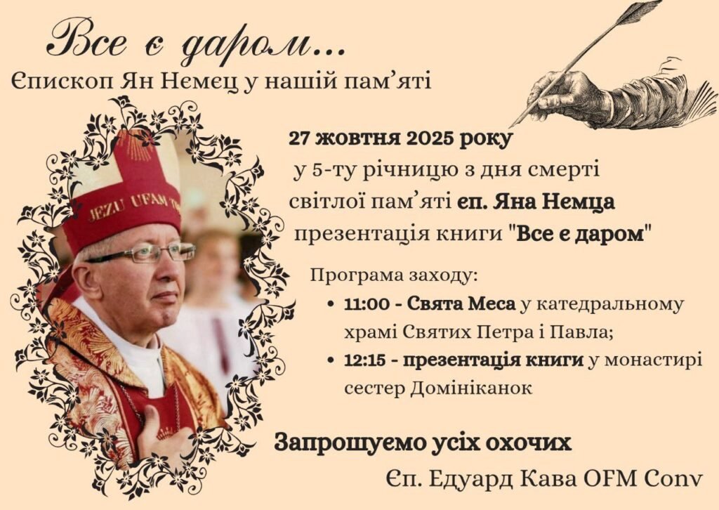 27 жовтня цього року, у п’яту річницю смерті єпископа Яна Нємца, відбудеться презентація книги «Все є даром».