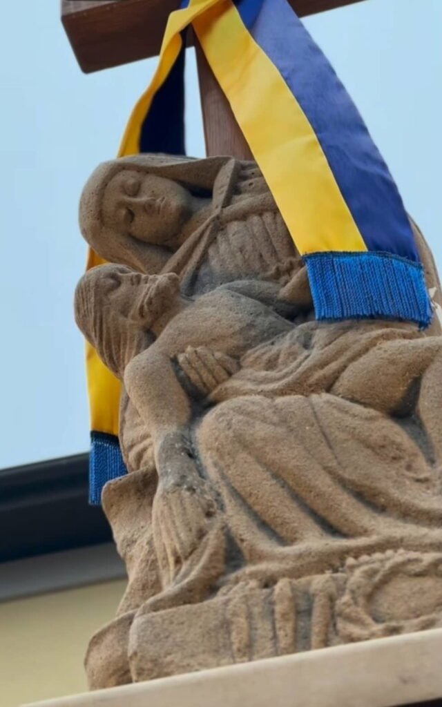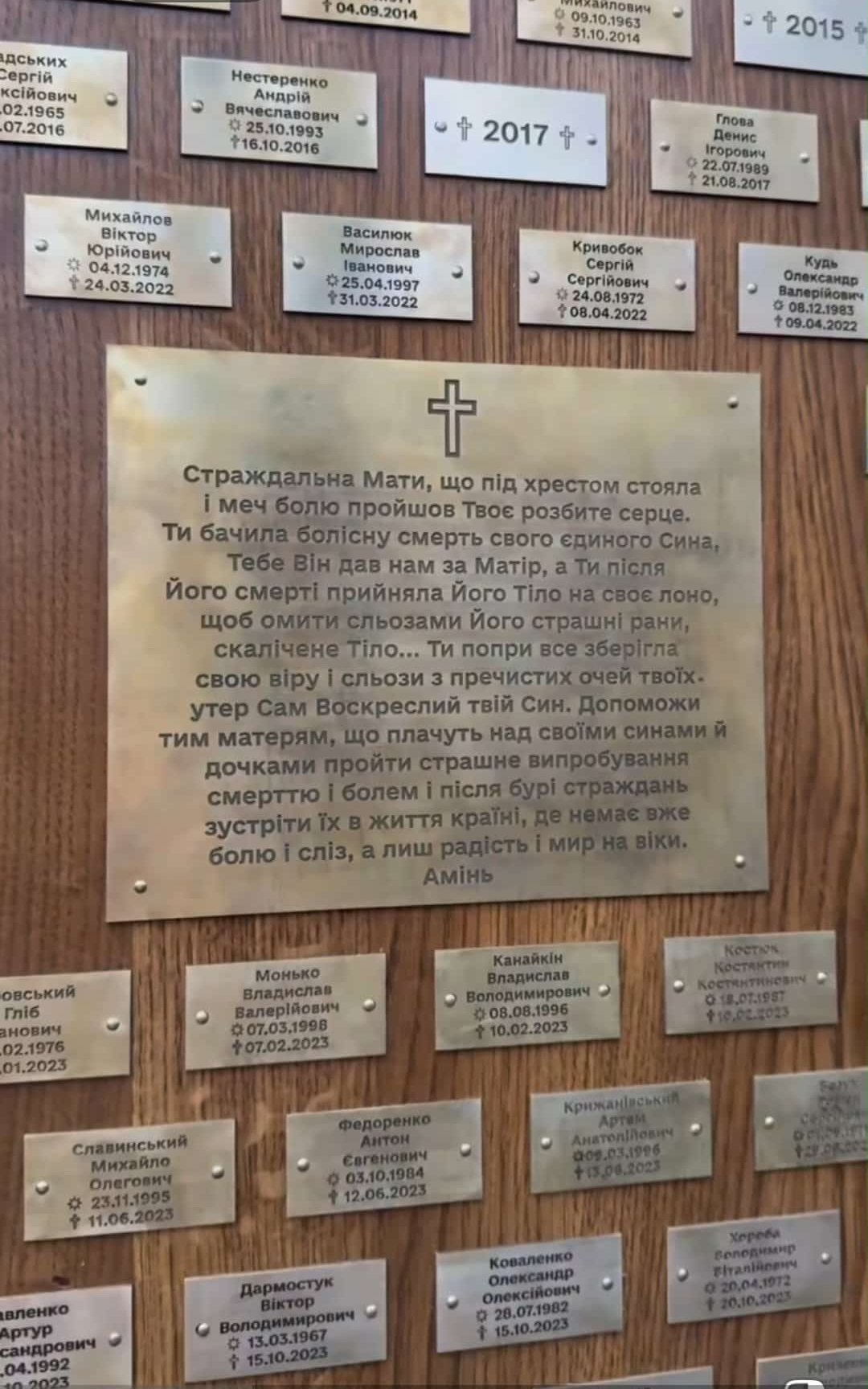 Мурований постамент увінчує фігура Страждальної Богородиці, де Пресвята Діва Марія тримає на своїх руках мертве тіло свого Сина – Ісуса Христа. На меморіалі встановлено 270 табличок з іменами загиблих Захисників.