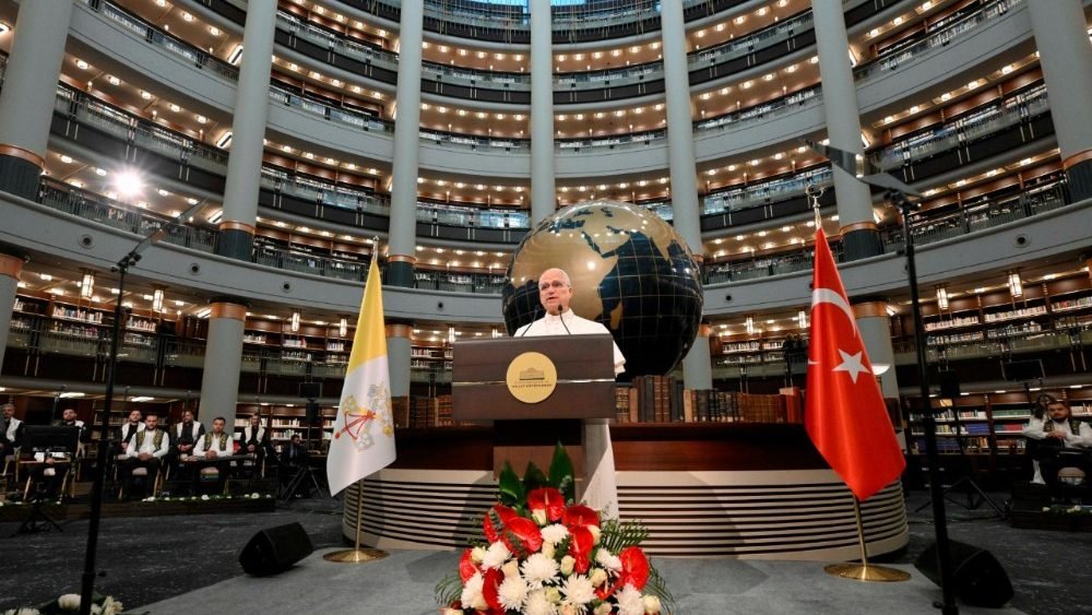«Святий Престол, з його єдиною силою, тобто духовною і моральною, бажає співпрацювати з усіма країнами, які дбають про цілісний розвиток кожної людини й усіх чоловіків та жінок. Тож прямуймо вперед разом, у правді та дружбі, смиренно уповаючи на Божу допомогу», – цими словами Папа Лев XIV підсумував свою першу промову, яку виголосив на турецькій землі. Прибувши у четвер, 27 листопада 2025 р. до Анкари, столиці Туреччини, Святіший Отець здійснив протокольні заходи та візит ввічливості до Президента, після чого прибув до Національної бібліотеки, де відбулася зустріч з представниками влади, дипломатичного корпусу й громадянського суспільства.