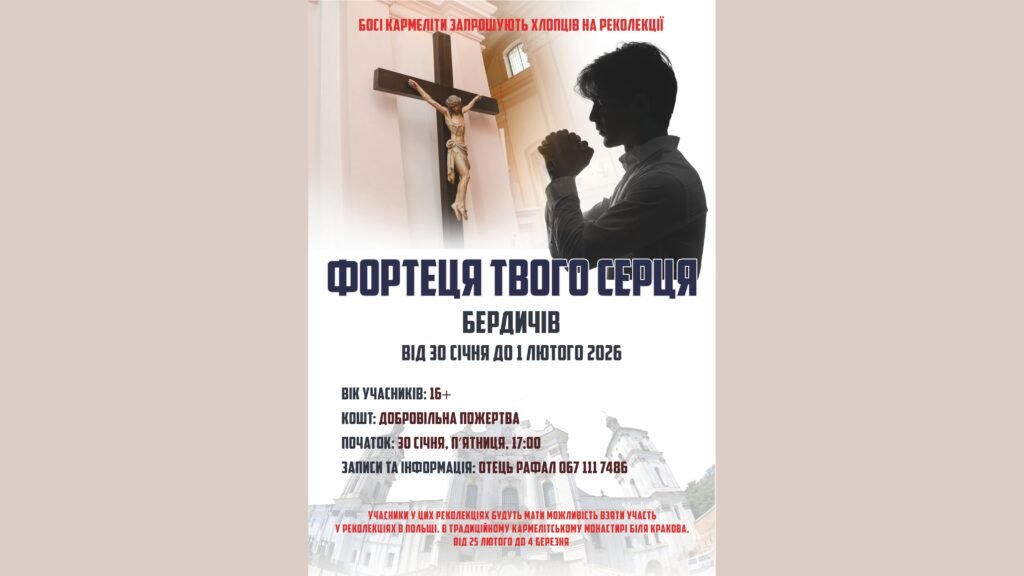 Босі кармеліти оголошують набір на цикл реколекцій для молодих чоловіків віком від 16 років. Програма спрямована на духовну віднову та внутрішній прорив, надихає на глибоку зустріч із Богом і знайомство з духовними цінностями Ордену Кармелю.