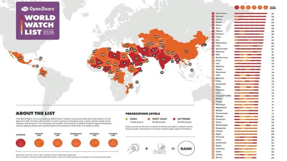 Понад 388 мільйонів християн зазнають переслідувань, рівень яких оцінюється щонайменше як високий, чи дискримінації з огляду на свою віру. Йдеться про кожного сьомого християнина в світі. Такими є дані рапорту, який 14 січня 2026 р. опублікувала благодійна організація «Open Doors» (Відкриті Двері) на своєму веб-порталі, що містить також «World Watch List 2026» – список п’ятдесяти країн світу, де найбільше переслідують християн. Згідно з їхніми даними, 315 мільйонів переслідуваних християн живуть саме в згаданих країнах.