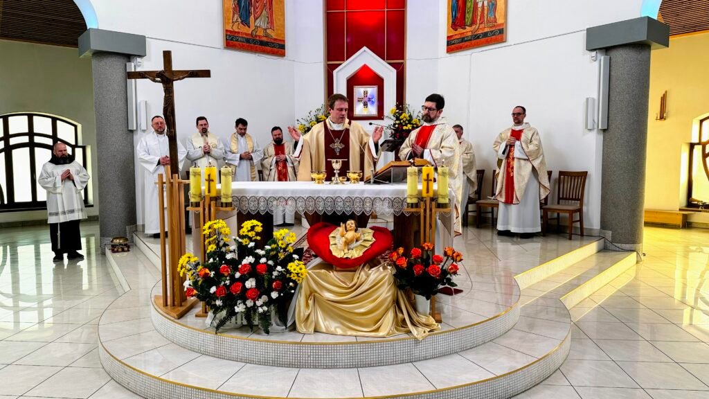 Після адорації відбулась Свята Меса, яку очолив єпископ–помічник Київсько–Житомирської дієцезії Олександр Язловецький. У проповіді він підкреслив надзвичайні можливості, які відкриваються перед богопосвяченими особами. Такими можливостями є спасіння своєї душі, відшкодування Богу за свої гріхи та гріхи цілого світу, а також заступницька молитва. «Чого варта лише можливість мати табернакулюм в наших будинках. Господь є фізично присутній з нами. Бог дав нам такий шанс спасти свою душу», – зазаначив єпископ Олександр.