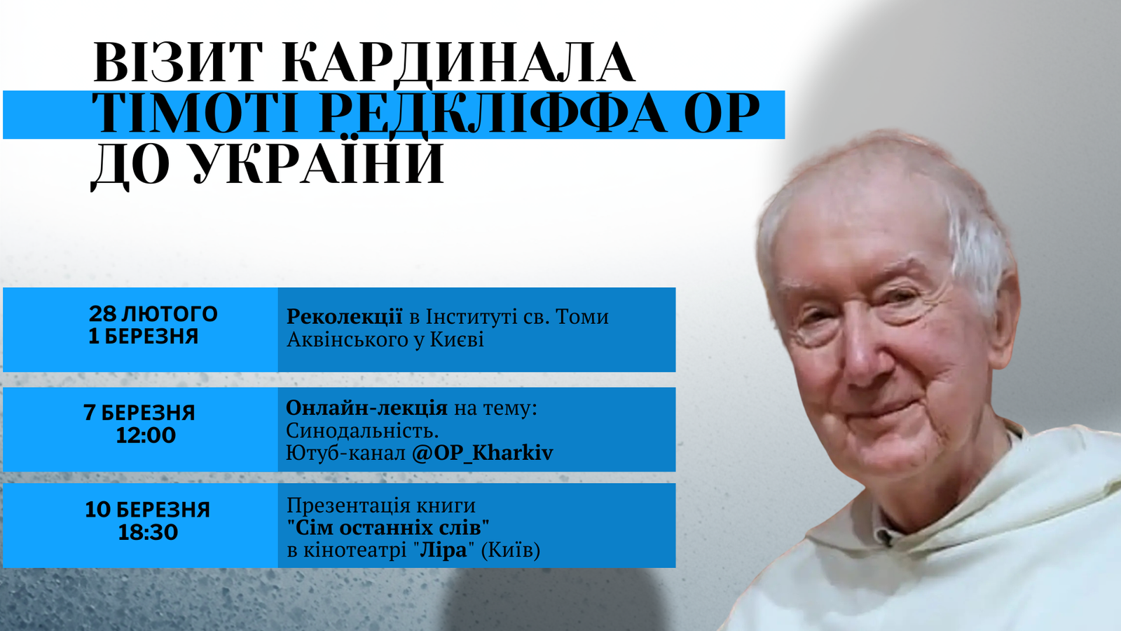 10 березня о 18:30 у кінотеатрі «Ліра» в Києві (вул. Велика Житомирська, 40) відбудеться дискусія, присвячена досвіду віри під час війни та презентація книги о. Тімоті Редкліффа «Сім останніх слів», яка була видана видавництвом Святого Павла у співпраці з Вікаріатом домініканського ордену в Україні. Це буде нагода особисто зустрітися з автором, дізнатися про його досвід віри, а також поставити йому запитання.