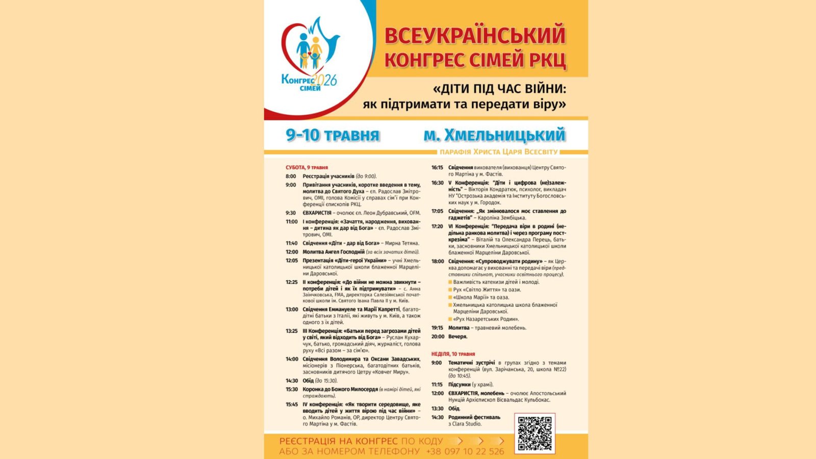 Комісія у справах душпастирства родин при Конференції єпископів Римо-Католицької Церкви в Україні у співпраці з Дієцезіальним душпастирством родин Кам’янець-Подільської дієцезії та парафією Христа Царя Всесвіту в м. Хмельницькому запрошує на Всеукраїнський конгрес сімей РКЦ.