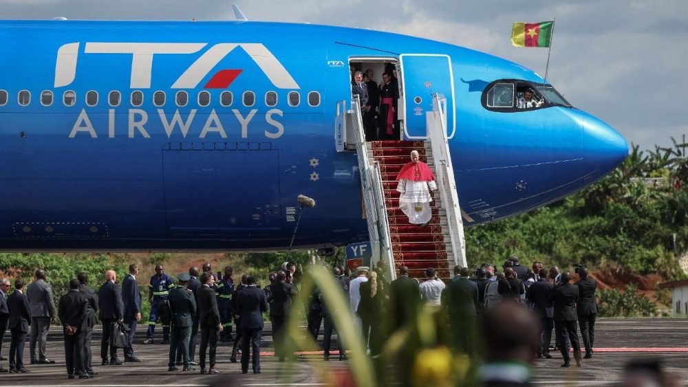 Літак з Папою Левом XIV на борту приземлився в міжнародному аеропорту Яунде перед 15:00 місцевого часу (17:00 – київського), де відбулася церемонія привітання. Біля трапу Святішого Отця зустрів Прем’єр-міністр Камеруну Жозеф Діон Нґуте. Двоє дітей вручили квіти, прозвучали державні гімни, віддано військові почесті та відбулося взаємне представлення делегацій.