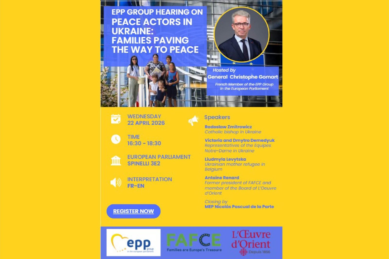 22 квітня 2026 року в приміщенні Європейського парламенту відбудеться конференція під назвою «Миротворці в Україні: сім’ї прокладають шлях до миру». Захід організовано за ініціативи депутата Європарламенту, генерала Крістофа Гомара (група «Європейська народна партія») у співпраці з FAFCE та L’Œuvre d’Orient.