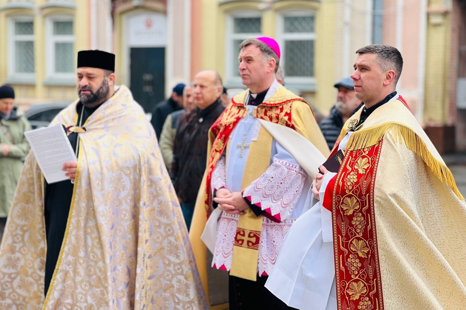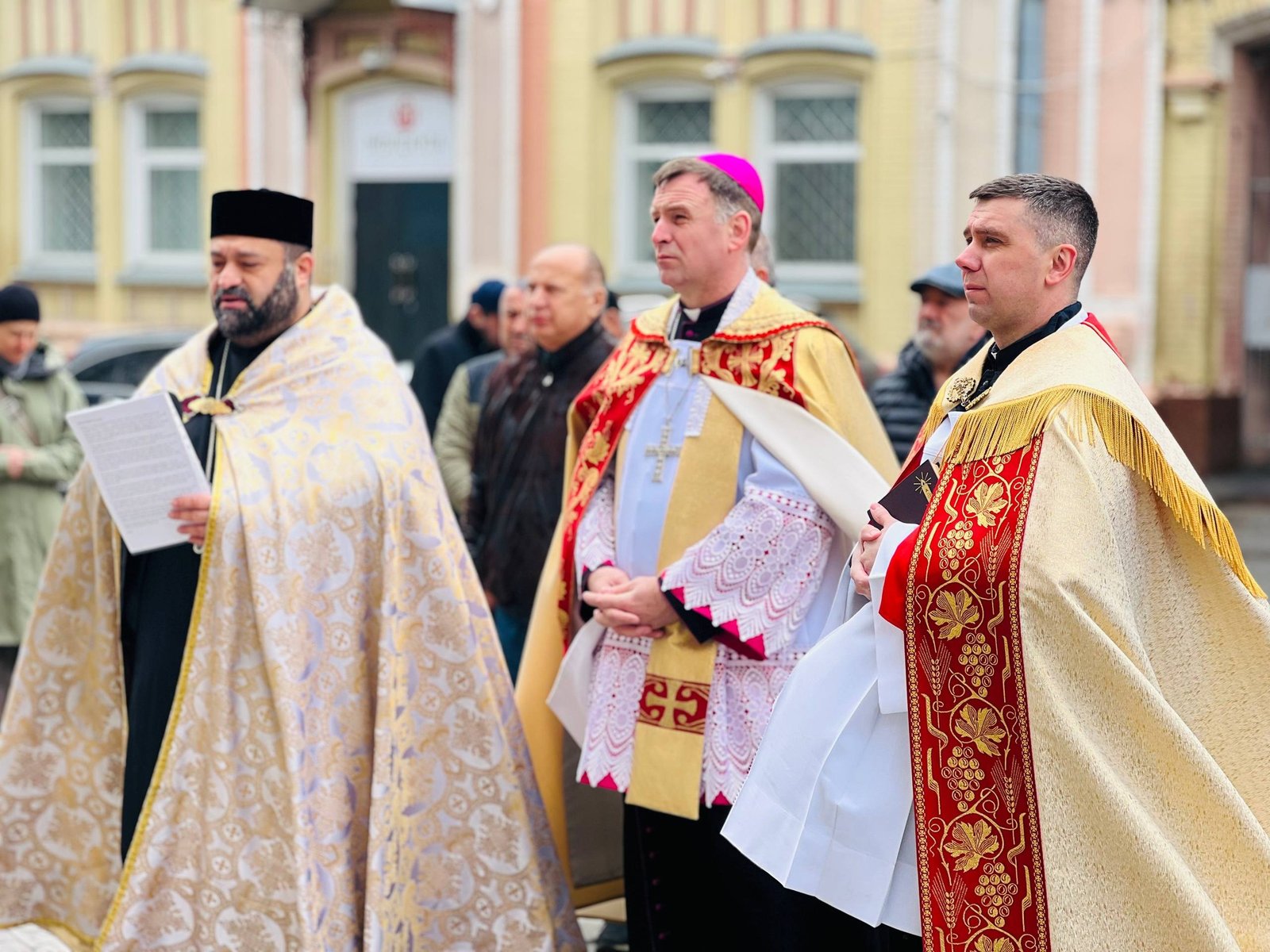 Під час молитви єпископ Павло Гончарук звернувся зі словами: «Господи, звертаємо свій погляд до Тебе – Того, Хто є з нами і Хто бачить людські серця. Ми стоїмо біля таблиць, які нагадують нам про жорстокість, але водночас і про людяність. Люди вбивали, а інші – рятували. І ті, і ті – люди, але з різними серцями.
