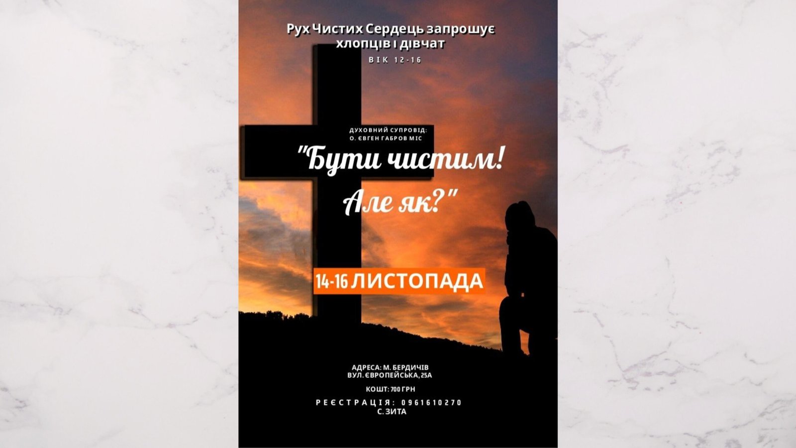 У середині листопада у Бердичеві відбудуться реколекції для хлопців і дівчат, які бажають долучитися до Руху Чистих Сердець. Такі дні духовної віднови – це нагода разом будувати відносини з Богом, ближніми та собою, знайти нових друзів, почути відповіді на свої питання, цікаві конференції, разом молитися та зростати у вірі.