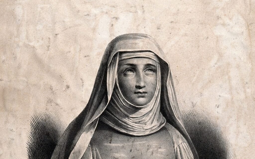 Зображають святу в королівських шатах, інколи під час роздавання милостині. Атрибути – корона, модель храму й монастиря.